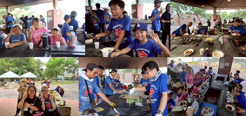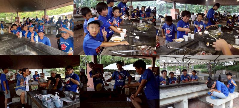 部屋に荷物を置いてさあBBQ、しっかり食べてよーとコーチ、お父さんたちが汗だくになりながら